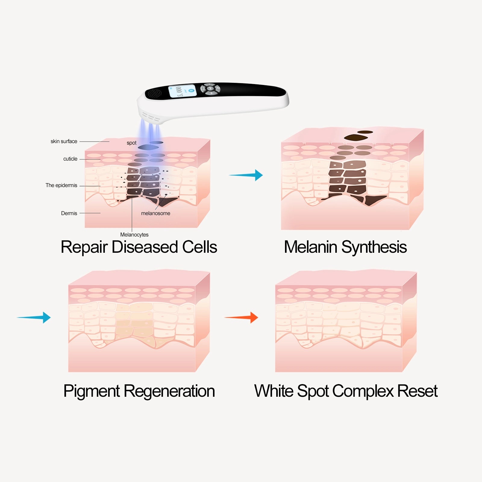 This device produces focused, high intensity light that reaches approximately 1.5mm into the superficial dermis. This is important because that depth allows the light to better induce T-cell apoptosis in white lesions, which can cause them to disappear.
