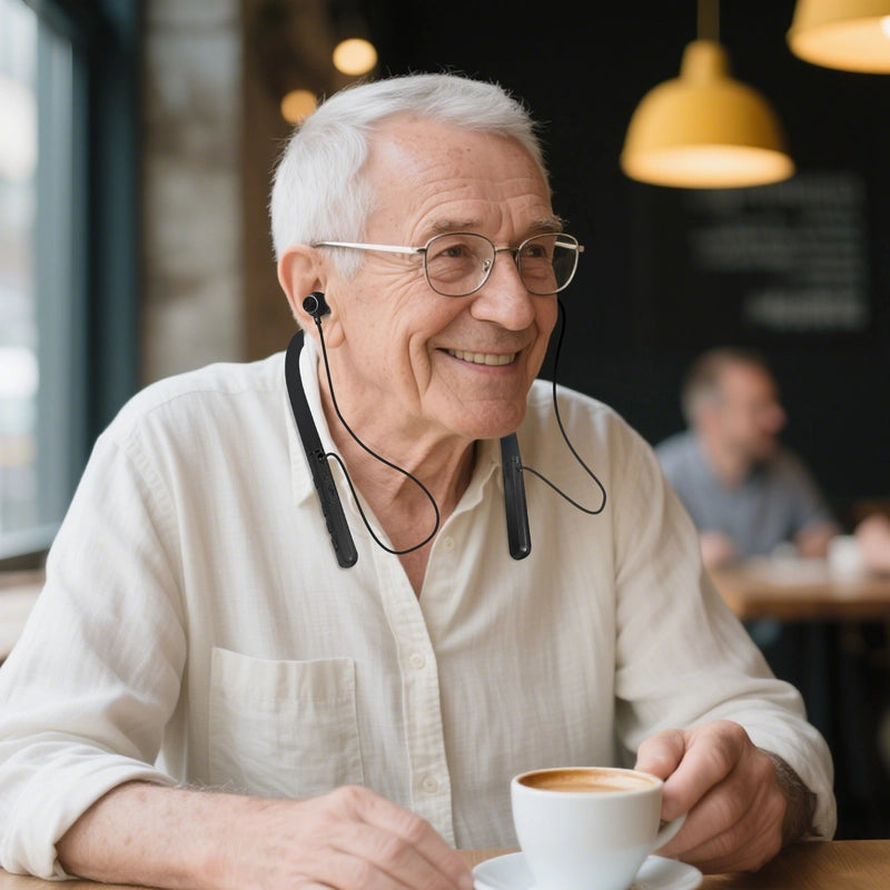 The neckband hearing aids pick up sound through dual microphones, prioritizing the voice in front of you while filtering out ambient noise. A digital chip performs noise reduction and frequency division on the signal, optimizing it for the speech band. Based on the user's hearing loss, the chip automatically adjusts gain and performs nonlinear amplification to avoid distortion. The processed signal is converted into sound waves by the receiver and transmitted to the ear canal through the earbud. When the sound is fed back to the microphone, the system uses phase cancellation technology to eliminate howling, ensuring a clear and comfortable listening experience.